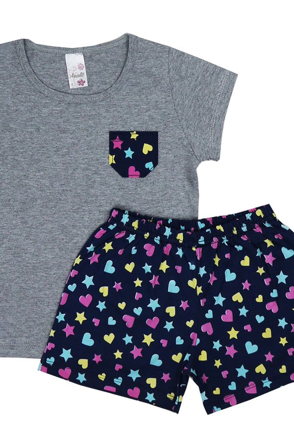 Manga curta, bolso frontal na cor da estampa da bermuda;